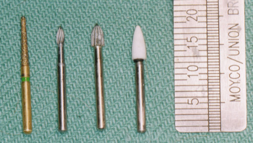 These heads are used for finishing restorations, soft tissue recontouring, alveolaplasty, enameloplasty and odontoplasty. They can be obtained as 12 or 30 bladed burs in carbide steel or as diamond heads of various shapes. They are also available as white stone, for composite, or green stone, for amalgam.